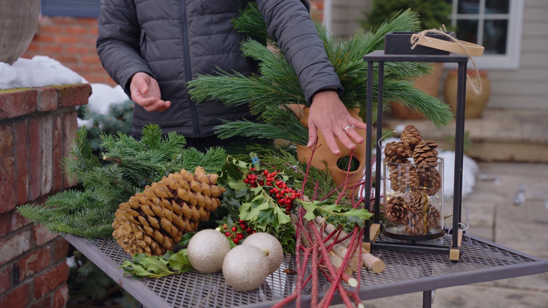 - Build in your texture and color. Place in sugar cones, winter berries, and additional branches. Adjust the spacing and angles until it feels balanced and full.
